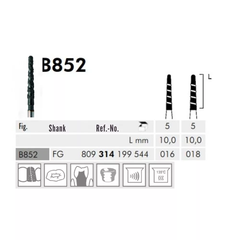 A B852 kerek, kúp alakú fejforma, FG befogószárral. Az FG szár kerekített befogó résszel turbinákba, gyorsító könyökdarabokba és sebészeti gyorsító könyökdarabokba használható. A szuperdurva szemcseméret hatékony és gyors anyageltávolítást biztosít. Alkalmazási területe a régi tömések eltávolítása, koronapreparáció, koronák eltávolítása. A fej hossza 10mm, az átmérő mérete 1/10mm-ben 018. A csiszoló nem steril csomagolásban érkezik. Többféle felhasználási módra alkalmas, így rugalmasan alkalmazható a klinikai igényeknek megfelelően. Az eszköz betétrendezés elszámolásával is kezelhető, ami megkönnyíti a készletgazdálkodást és a költséghatékony használatot a praxisban. A Black Cobra turbo gyémántcsiszoló nemcsak a hatékonyságot és a precizitást garantálja, hanem a tartósság és a klinikai kényelem szempontjából is ideális választás minden intenzív fogászati kezeléshez.