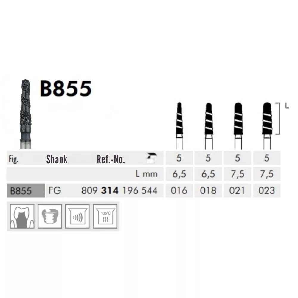A B855 kerek, kúp alakú fejforma, FG befogószárral. Az FG szár kerekített befogó résszel turbinákba, gyorsító könyökdarabokba és sebészeti gyorsító könyökdarabokba használható. A szuperdurva szemcseméret hatékony és gyors anyageltávolítást biztosít. Alkalmazási területe a korona előkészítése. A fej hossza 6.5mm, az átmérő mérete 1/10mm-ben 016. A csiszoló nem steril csomagolásban érkezik. Többféle felhasználási módra alkalmas, így rugalmasan alkalmazható a klinikai igényeknek megfelelően. Az eszköz betétrendezés elszámolásával is kezelhető, ami megkönnyíti a készletgazdálkodást és a költséghatékony használatot a praxisban. A Black Cobra turbo gyémántcsiszoló nemcsak a hatékonyságot és a precizitást garantálja, hanem a tartósság és a klinikai kényelem szempontjából is ideális választás minden intenzív fogászati kezeléshez.