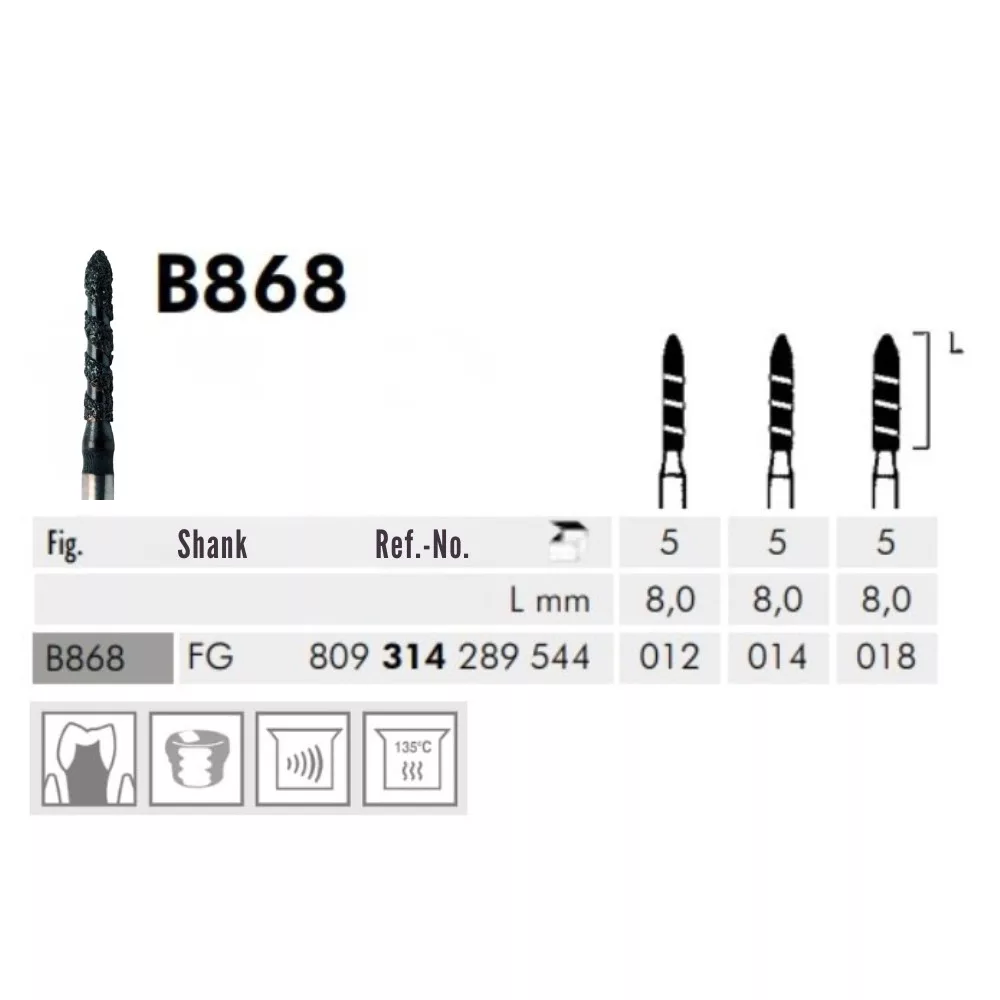 A B868 torpedó alakú fejforma, FG befogószárral. Az FG szár kerekített befogó résszel turbinákba, gyorsító könyökdarabokba és sebészeti gyorsító könyökdarabokba használható. A szuperdurva szemcseméret hatékony és gyors anyageltávolítást biztosít. Alkalmazási területe a korona előkészítése. A fej hossza 8mm, az átmérő mérete 1/10mm-ben 014. A csiszoló nem steril csomagolásban érkezik. Többféle felhasználási módra alkalmas, így rugalmasan alkalmazható a klinikai igényeknek megfelelően. Az eszköz betétrendezés elszámolásával is kezelhető, ami megkönnyíti a készletgazdálkodást és a költséghatékony használatot a praxisban. A Black Cobra turbo gyémántcsiszoló nemcsak a hatékonyságot és a precizitást garantálja, hanem a tartósság és a klinikai kényelem szempontjából is ideális választás minden intenzív fogászati kezeléshez.