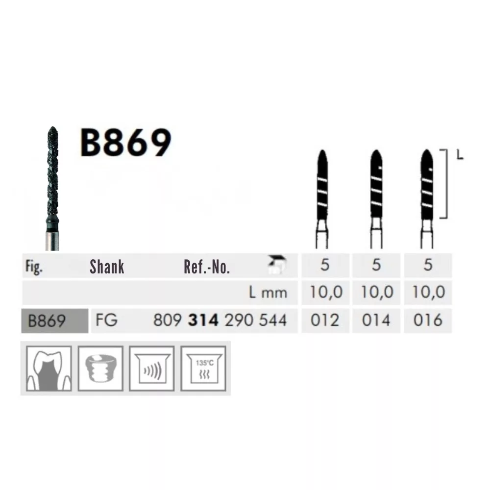 A B869 torpedó alakú fejforma, FG befogószárral. Az FG szár kerekített befogó résszel turbinákba, gyorsító könyökdarabokba és sebészeti gyorsító könyökdarabokba használható. A szuperdurva szemcseméret hatékony és gyors anyageltávolítást biztosít. Alkalmazási területe a korona előkészítése. A fej hossza 10mm, az átmérő mérete 1/10mm-ben 012. A csiszoló nem steril csomagolásban érkezik. Többféle felhasználási módra alkalmas, így rugalmasan alkalmazható a klinikai igényeknek megfelelően. Az eszköz betétrendezés elszámolásával is kezelhető, ami megkönnyíti a készletgazdálkodást és a költséghatékony használatot a praxisban. A Black Cobra turbo gyémántcsiszoló nemcsak a hatékonyságot és a precizitást garantálja, hanem a tartósság és a klinikai kényelem szempontjából is ideális választás minden intenzív fogászati kezeléshez.