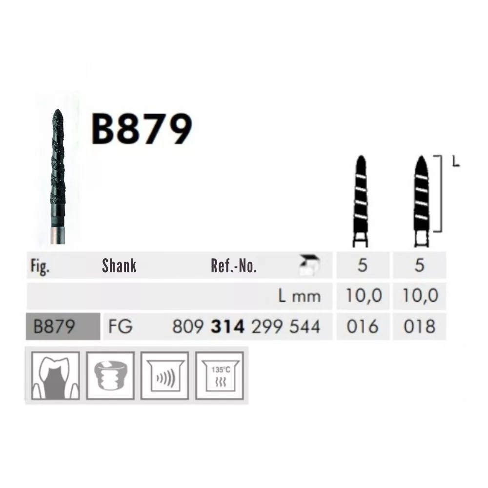 A B879 torpedó, kúp alakú fejforma, FG befogószárral. Az FG szár kerekített befogó résszel turbinákba, gyorsító könyökdarabokba és sebészeti gyorsító könyökdarabokba használható. A szuperdurva szemcseméret hatékony és gyors anyageltávolítást biztosít. Alkalmazási területe a korona előkészítése. A fej hossza 10mm, az átmérő mérete 1/10mm-ben 018. A csiszoló nem steril csomagolásban érkezik. Többféle felhasználási módra alkalmas, így rugalmasan alkalmazható a klinikai igényeknek megfelelően. Az eszköz betétrendezés elszámolásával is kezelhető, ami megkönnyíti a készletgazdálkodást és a költséghatékony használatot a praxisban. A Black Cobra turbo gyémántcsiszoló nemcsak a hatékonyságot és a precizitást garantálja, hanem a tartósság és a klinikai kényelem szempontjából is ideális választás minden intenzív fogászati kezeléshez.