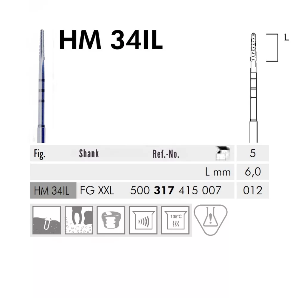 A Meisinger HM34IL modell FG XXL szárral rendelkezik, durva szemcsemérettel készül. A fej hossza 6mm, átmérő mérete 1/10mm-ben 012. Az FG szár kerekített befogó résszel turbinákba, gyorsító könyökdarabokba és sebészeti gyorsító könyökdarabokba használható. Maximális fordulatszáma 1.200rpm, így kifejezetten alkalmas implantológiai és szájsebészeti indikációkhoz. Az eszköz nem steril csomagolásban kerül forgalomba, többször használható, és megfelel a modern higiéniai előírásoknak, mivel tisztítása autoklávban 135°C-on, fúrófürdős fertőtlenítéssel, valamint ultrahangos tisztítással is elvégezhető. A termék depot elszámolással is elérhető, amely rugalmas beszerzési lehetőséget biztosít a rendelők számára, miközben garantálja a megbízható, hosszú távú klinikai használatot.