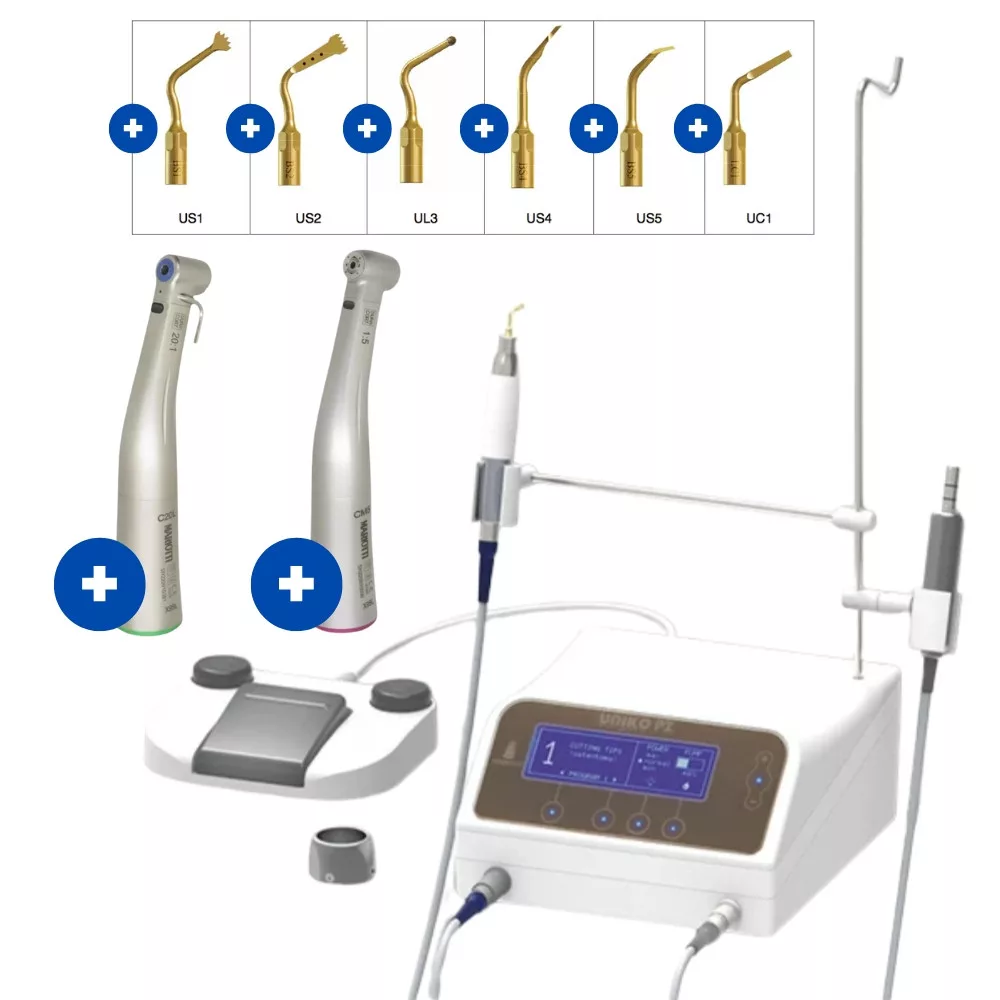A Mariotti UNIKO PZ készülékhez tartozik 1 darab C20L LED világítással ellátott implantológiai lassító könyökdarab 20:1 áttétellel a precíz implantációs munkákhoz, 1 darab CM5 fényes gyorsító könyökdarab a nagy fordulatszámot igénylő beavatkozásokhoz, valamint 1 darab praktikus és strapabíró szállító bőrönd a biztonságos tároláshoz és szállításhoz. A csomag része továbbá 6 darab piezo tip, amelyek lehetővé teszik, hogy a készüléket az egyéni klinikai igényekhez és különböző szájsebészeti indikációkhoz igazítsa.
